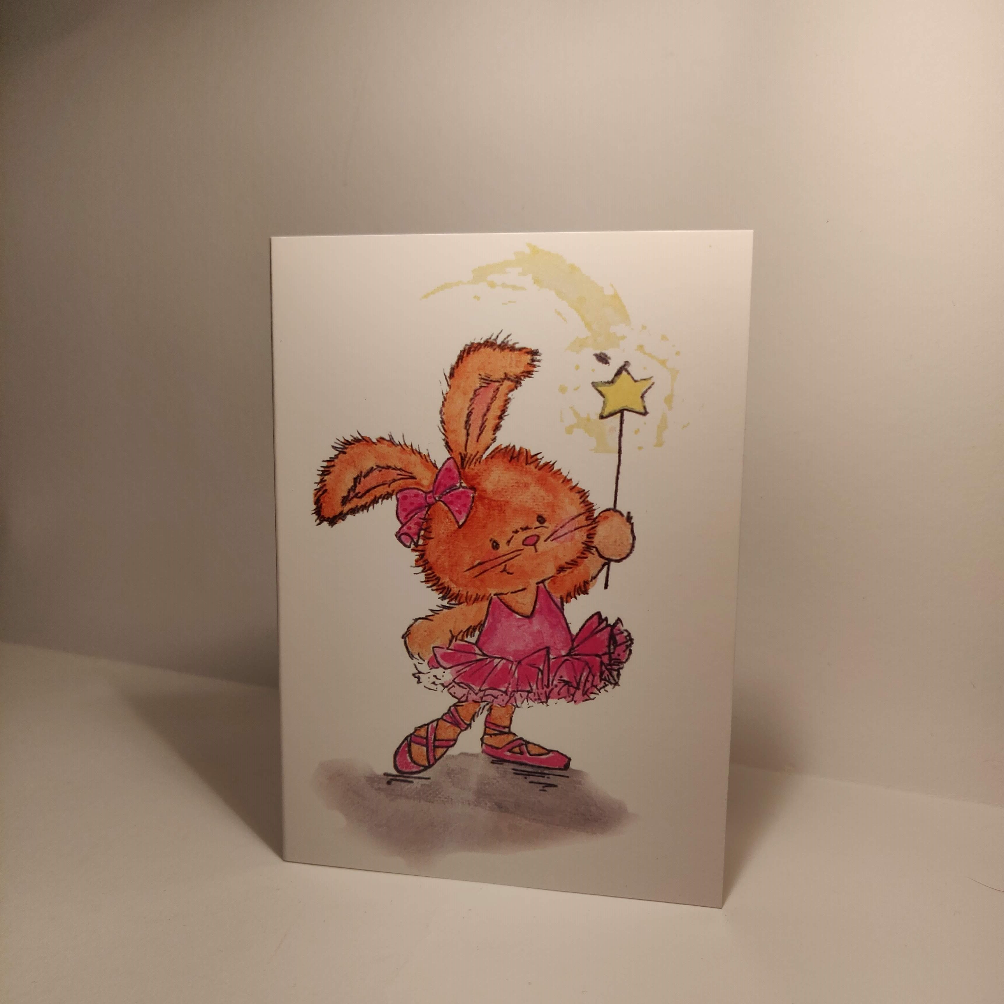 Dit is een kaart van een konijntje in een roze tutue