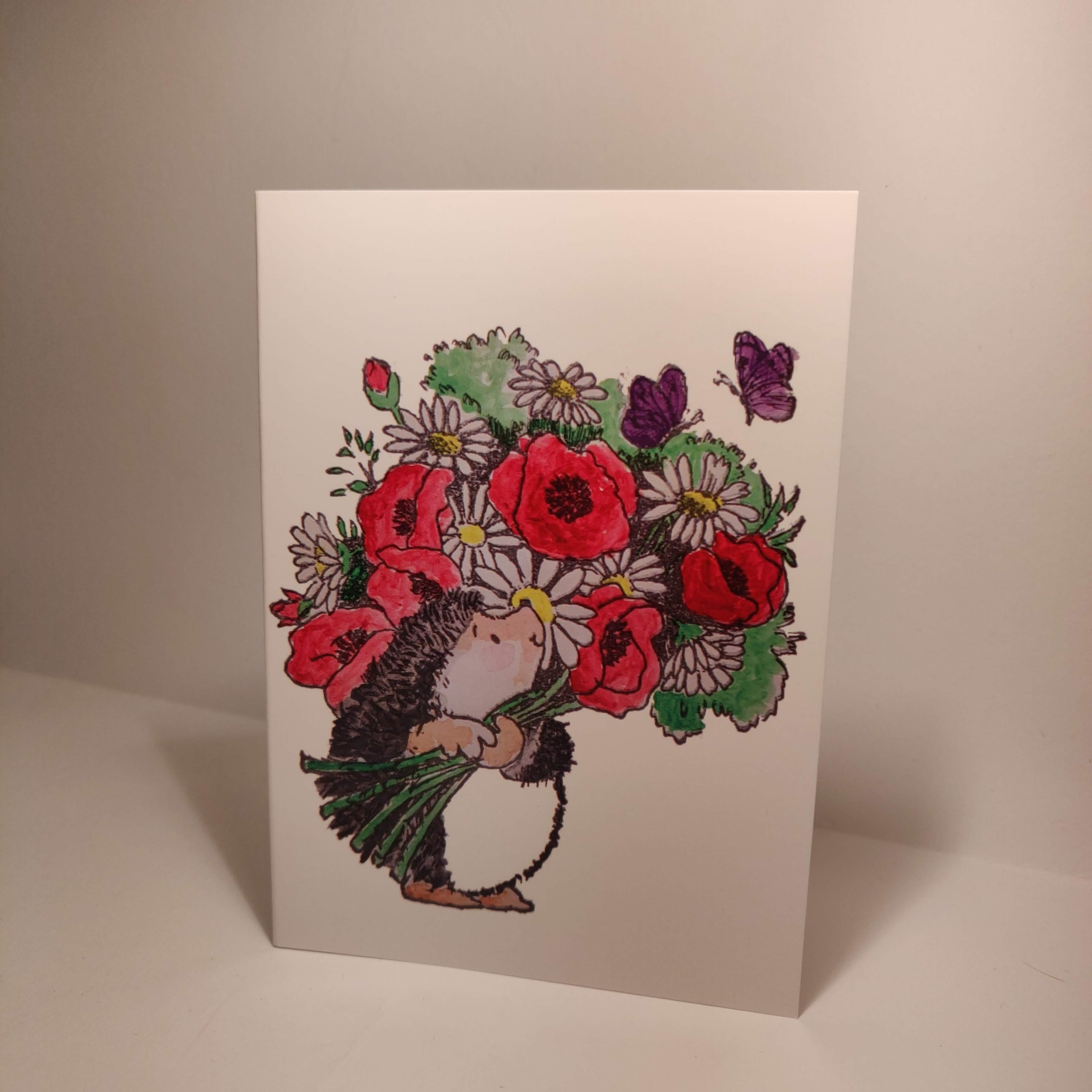 Dit is een kaart van een egeltje met een bos bloemen en twee vlinders