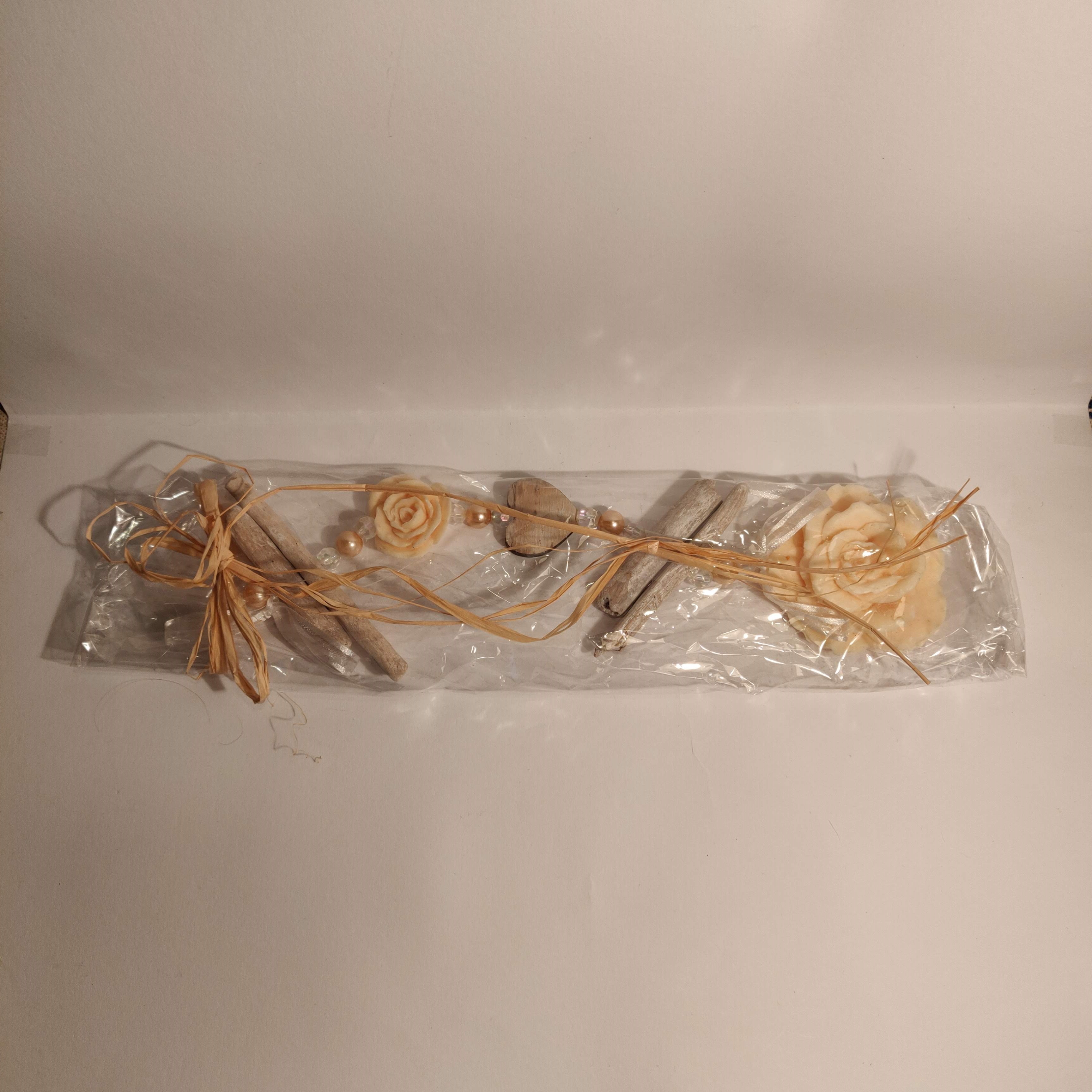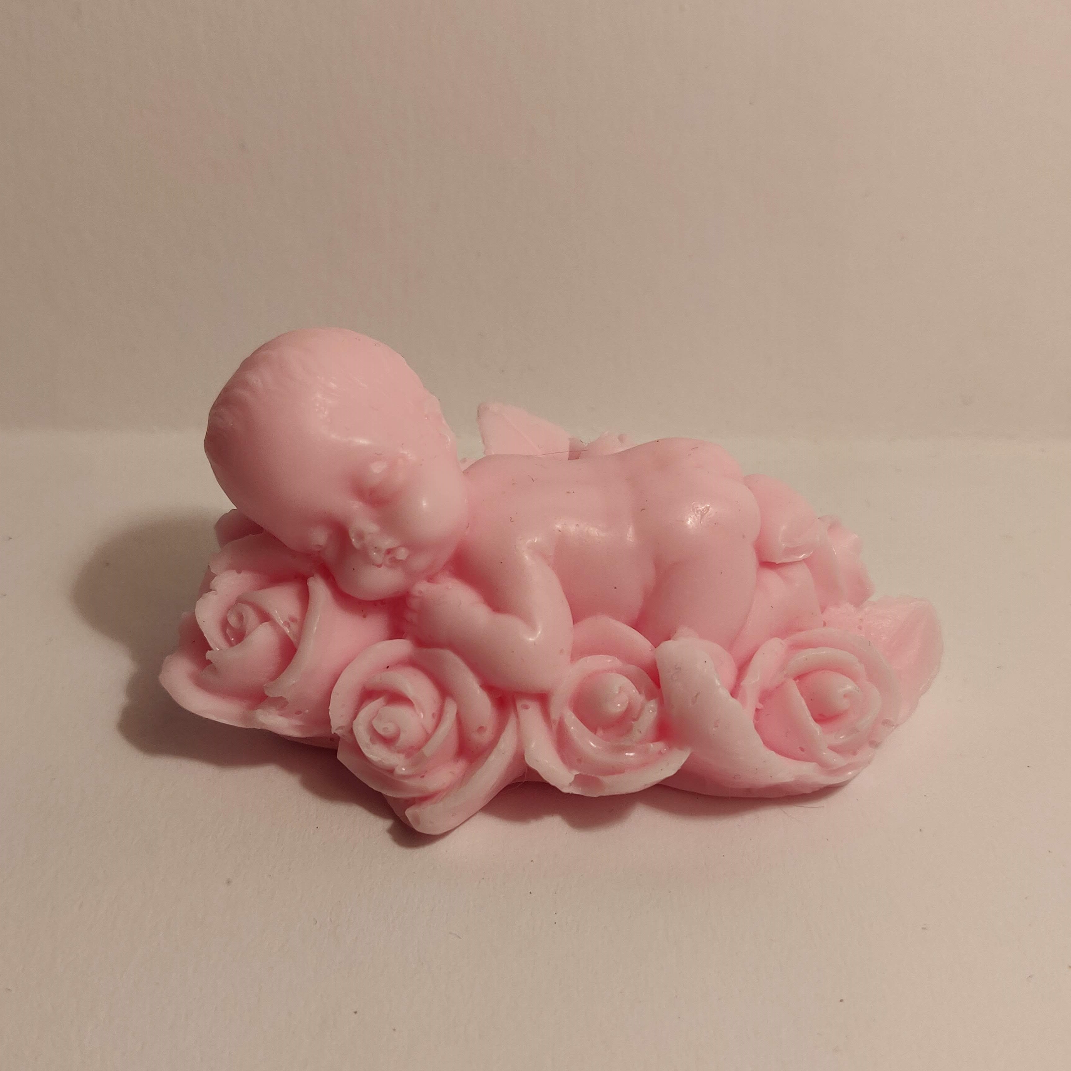 Dit is een zeepje van een baby die ligt op een bedje van rozen.